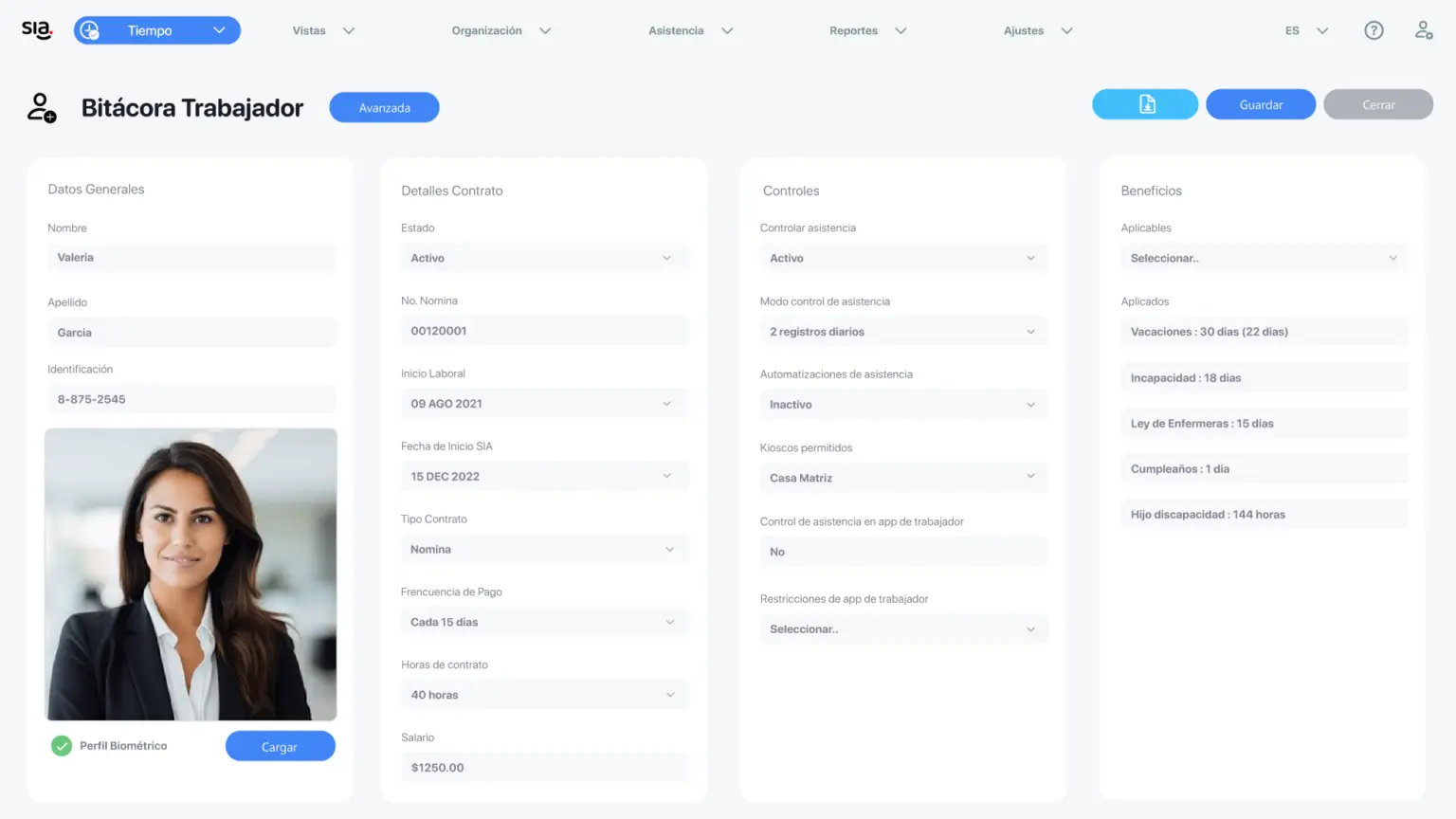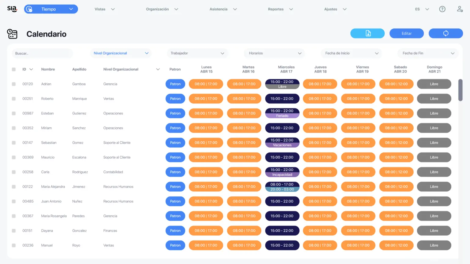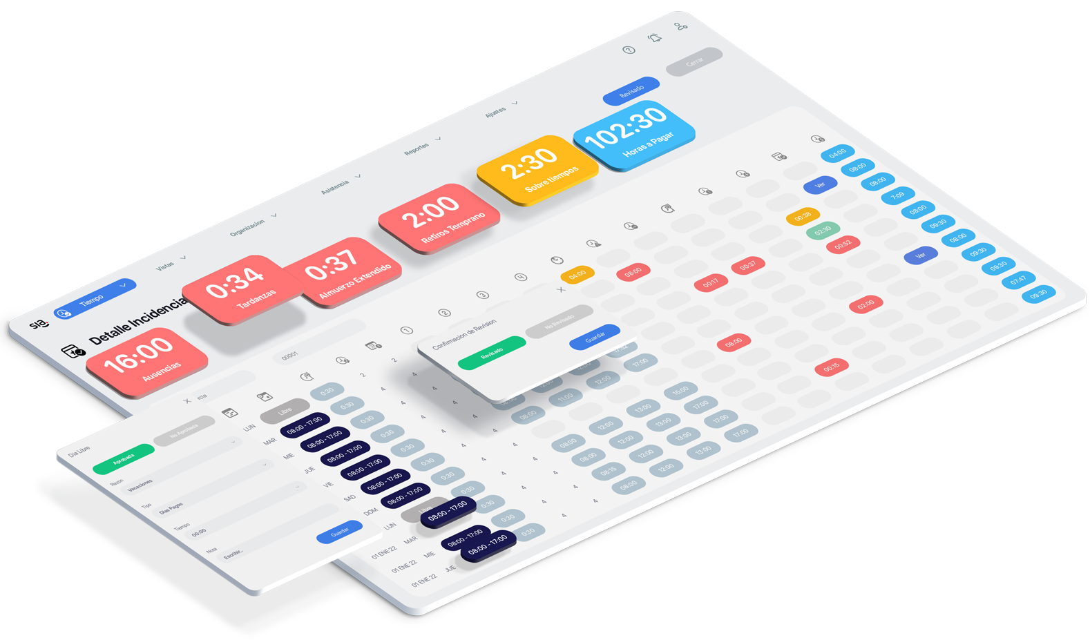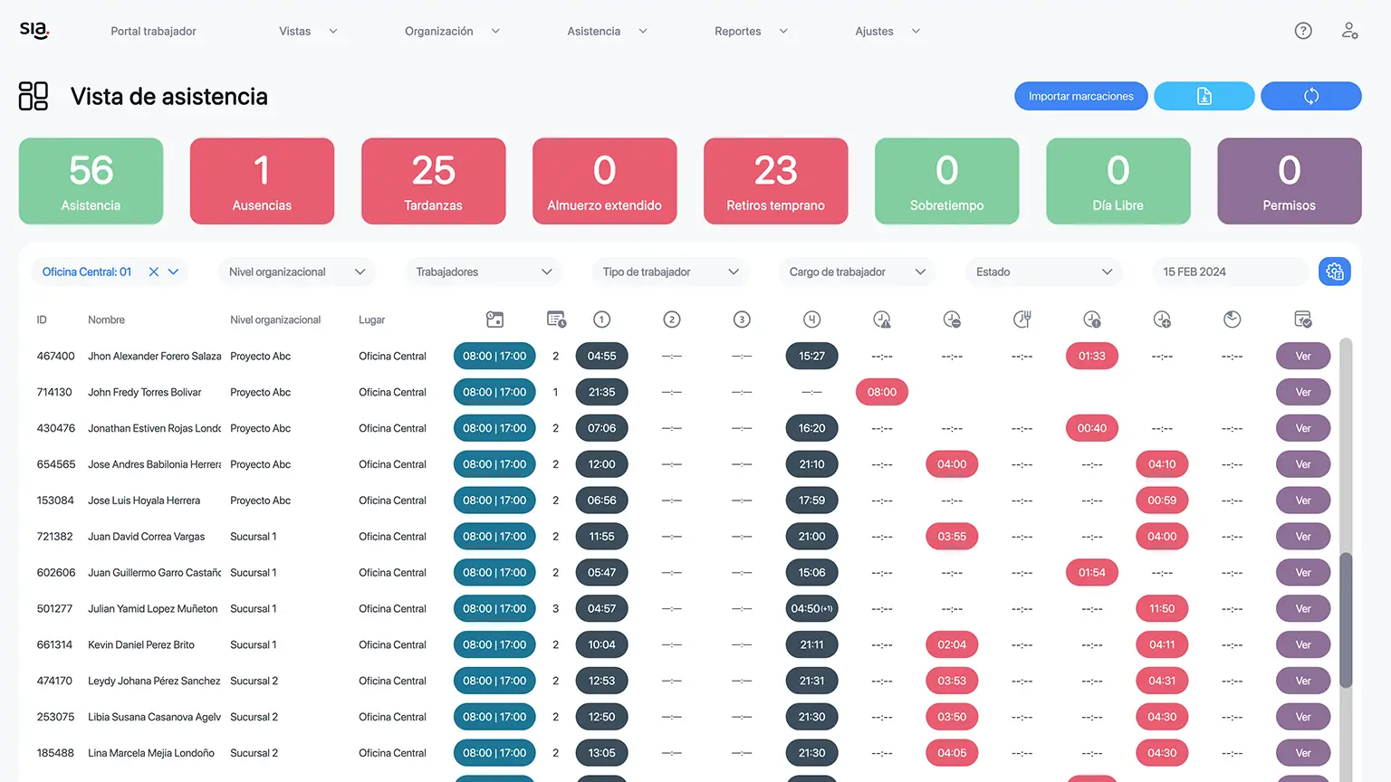 Controla la asistencia, planificación de horarios, salidas laborales, saldos, cálculo de horas trabajadas e incidencias con recargos de ley SIA se integra con cualquier sistema de nómina, ERP y Excel.