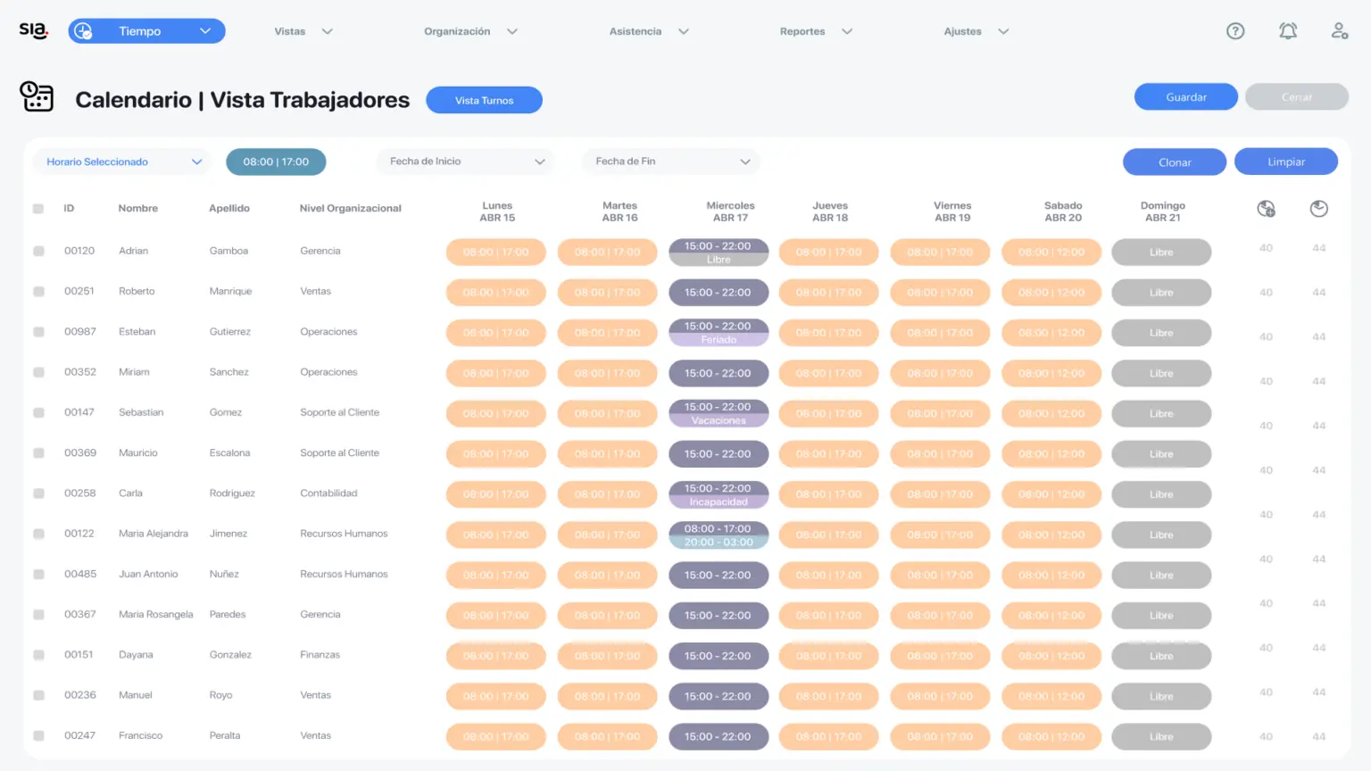 Controla la asistencia, planifica horarios, salidas laborales, horas trabajadas, incidencias con recargos de laborales.