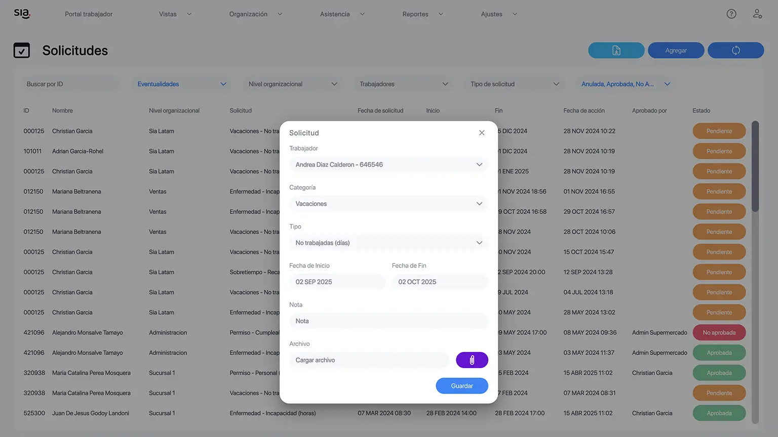 Centraliza el registro de vacaciones, incapacidades y permisos en un solo tablero con flujos de aprobación.